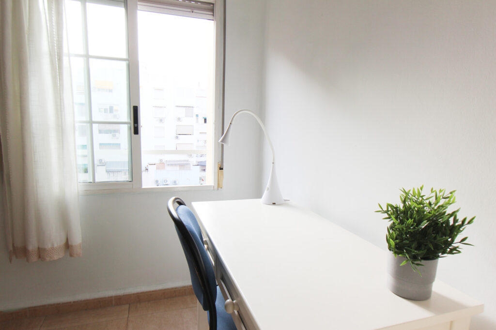 La habitación está amueblada con cama de 105 cm, mesilla de noche, escritorio y silla de estudio, estantería, armario y ventilador/lámpara regulable de techo con mando a distancia.